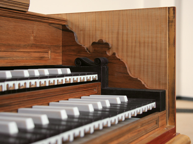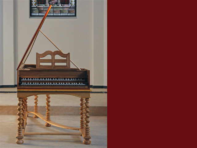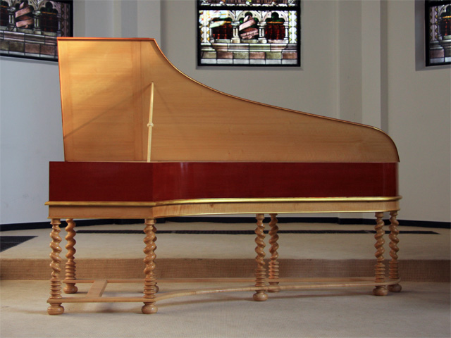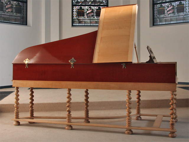 • Deutsches zweimanualiges Cembalo nach Michael Mietke (1710), 8′, 4′, 8′, Lautenzug, Tonumfang FF/GG – f“‘, Korpus aus Riegelahorn, dunkelrot gestrichen auf Kreidegrund, Untergestell holzsichtig mit vergoldeten Profilen.