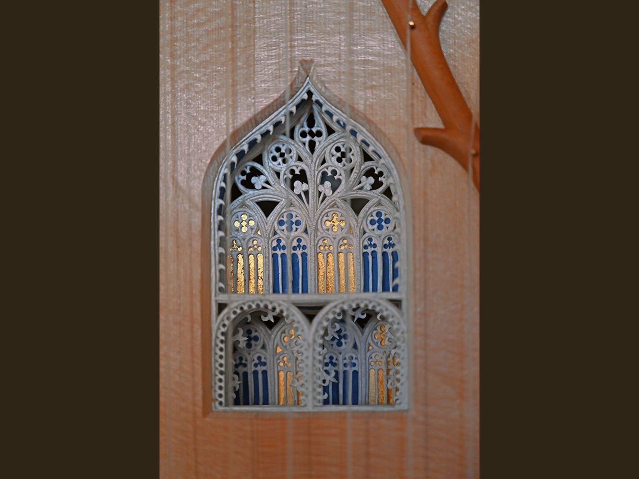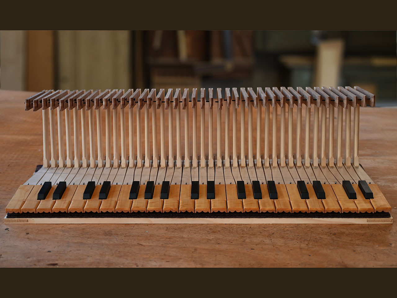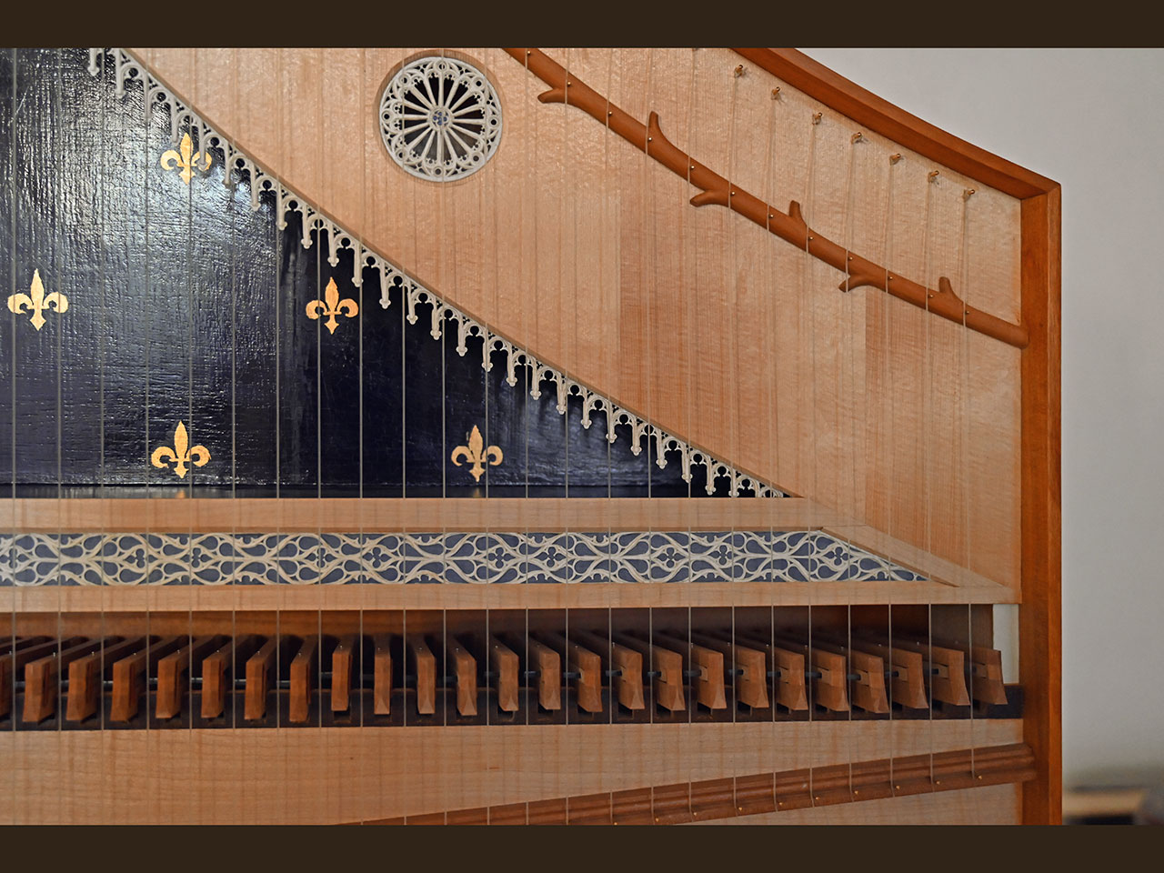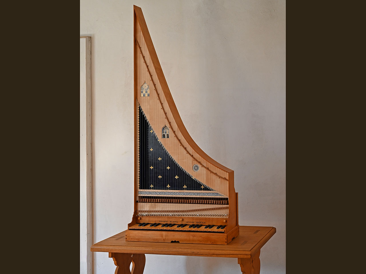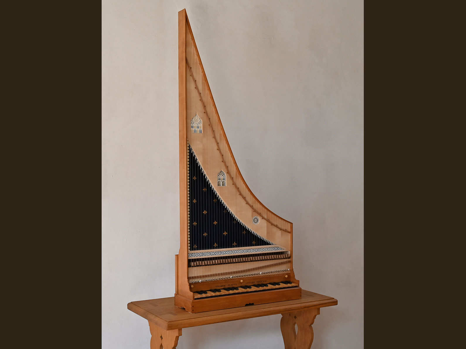 - Clavicytherium der Frührenaissance nach einem anonymen Vorbild, vermutlich Ulm um 1480, Korpus aus Kirschbaumholz, Resonanzboden aus feinjähriger Alpenfichte mit drei Rosetten und Zierrat aus Ziegenpergament, bezogen mit Darmsaiten, Tonumfang F-a“.