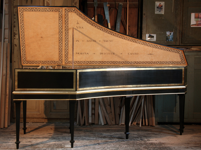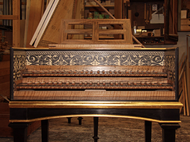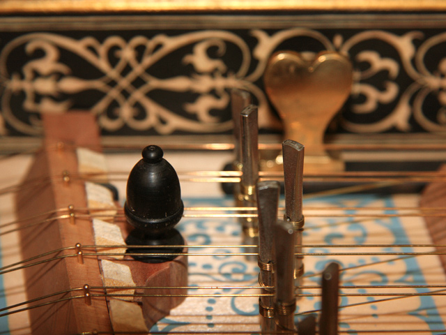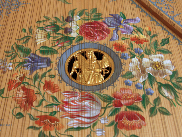 - Zweimanualiges flämisches Cembalo nach Johannes Ruckers (1624), petit ravalement um 1700, 8′, 4′, 8′, Lautenzug, Tonumfang GG, AA–d“‘, e“‘, Ausführung in französischer Manier, Resonanzbodenbemalung von Cornelis Verboom (Niederlande).