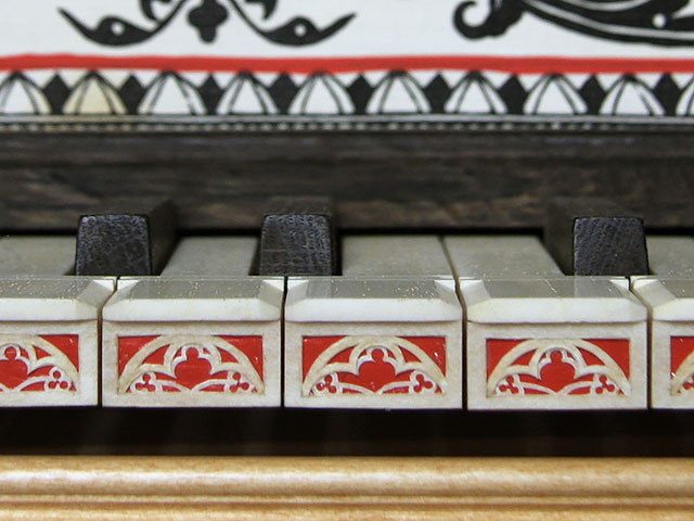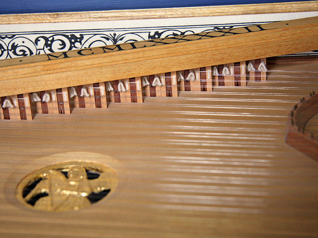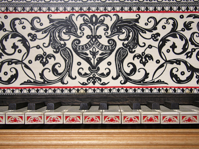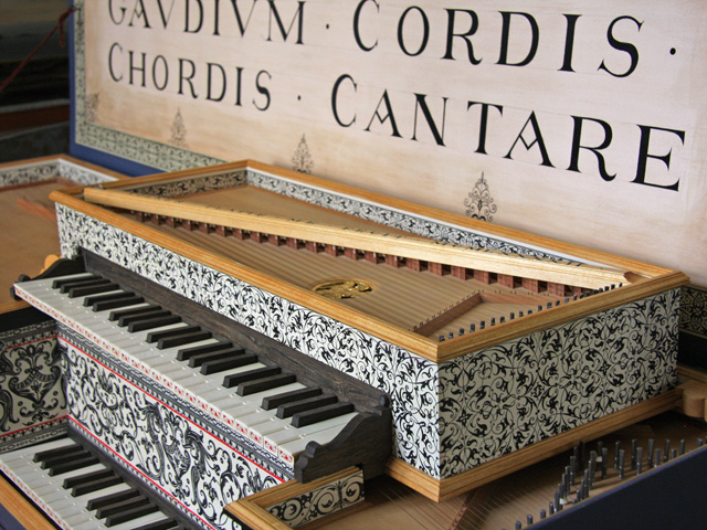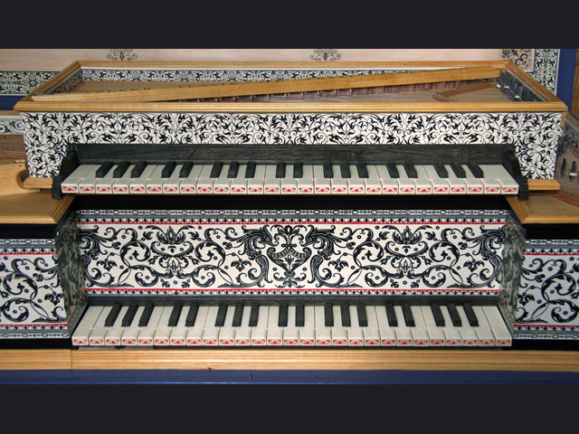 - Flämisches Doppelvirginal „Mutter und Kind“ nach Johannes Ruckers, um 1620, Tonumfang C/E – c“‘, 8′, 4′, zwei Instrumente miteinander koppelbar, Korpus aus Pappelholz mit Arabeskentapete innen, außen blau gefasst auf Kreidegrund mit gedrechseltem Untergestell aus Eichenholz.