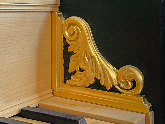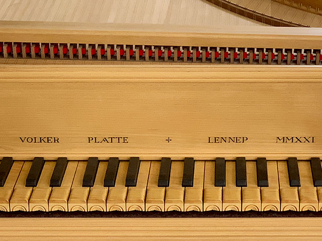 - Italienisches Cembalo nach Vorbildern des 17. Jahrhunderts, „false inner-outer”, mit erweitertem Tonumfang C – d“‘ und doppelter Transponiereinrichtung 466 Hz, 440 Hz, 415 Hz“.