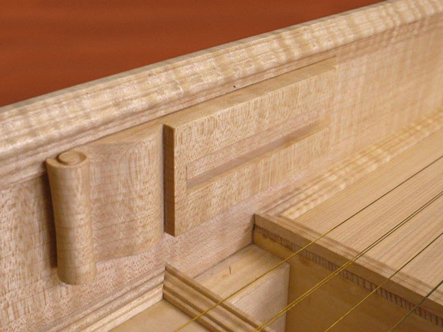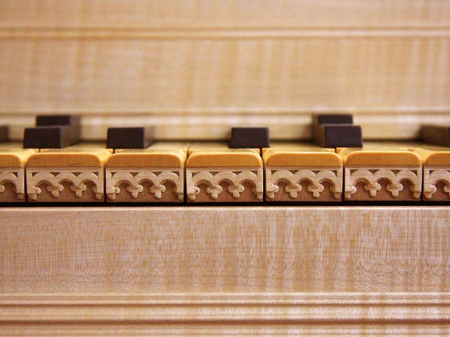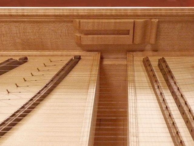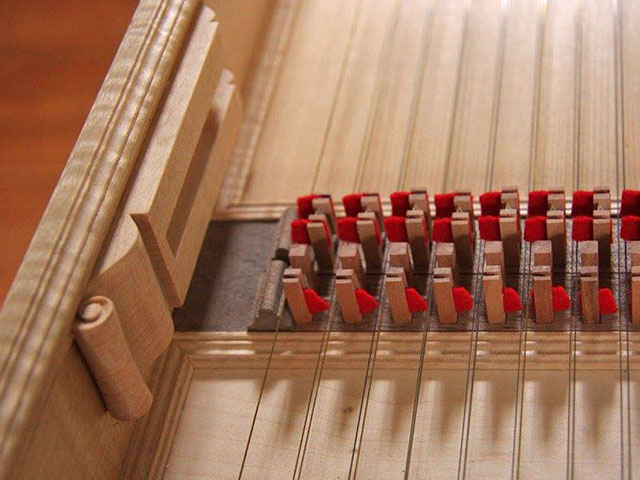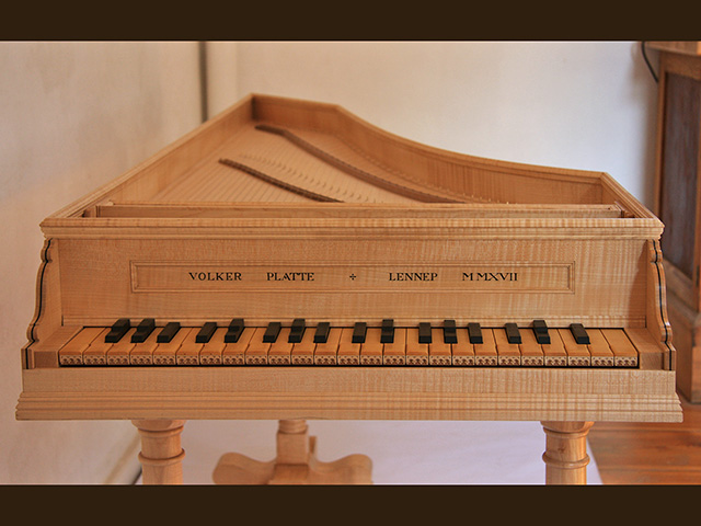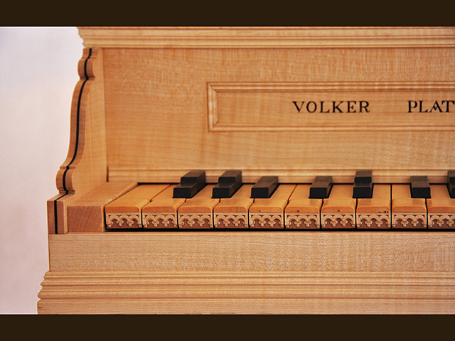 - Italienisches Renaissance-Cembalo mit Ahornkorpus, neapolitanischer Typ mit spitzem Basswinkel, nach einem anonymen Vorbild (um 1520) im Museum of Fine Arts in Boston, 8′, 4′, Tonumfang C/E–a“, mit geteilten Obertasten Dis/Es und Gis/As, Eisenmensur, Stimmtonhöhe a’=440 Hz.