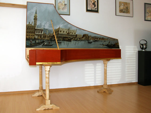 - Italienisches Cembalo nach Aelpidio Gregori (1726), erweiterter Tonumfang C/E–d“‘, 8′, 8′, mit Deckelgemälde nach Canaletto von Dörte Busch.