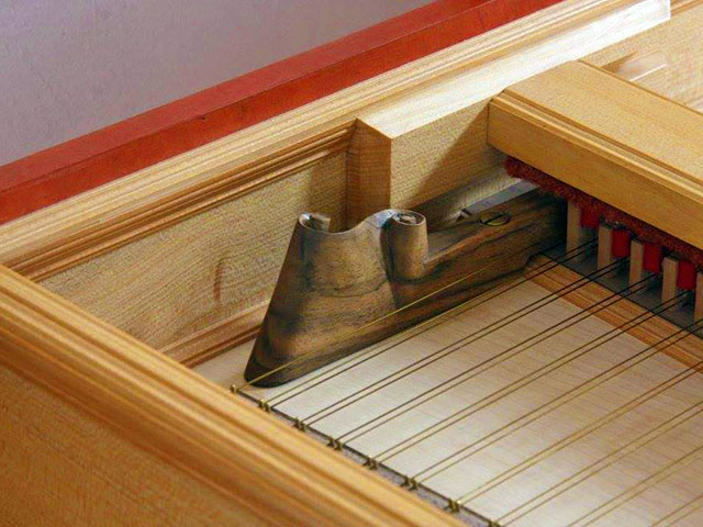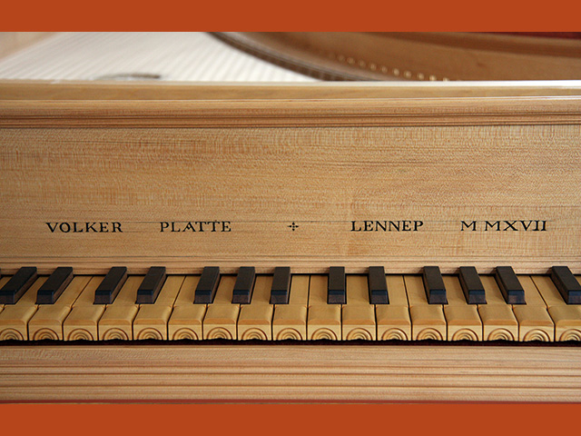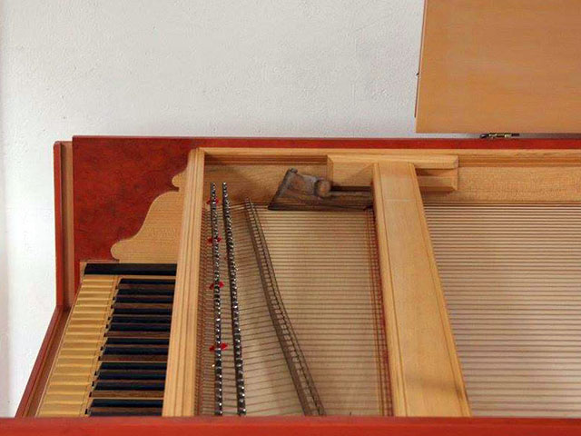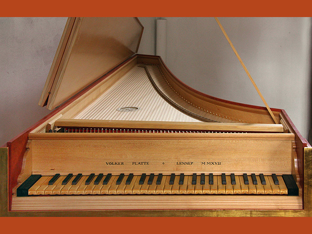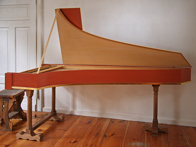 - Italienisches Cembalo nach Vorbildern um 1700, “false inner outer”, Tonumfang GG,AA–d“‘, zwei 8′-Register mit Schalthebeln.