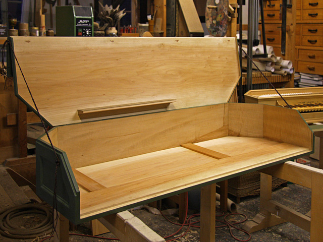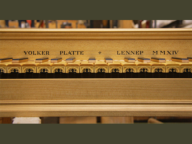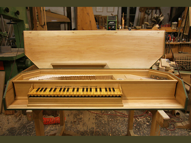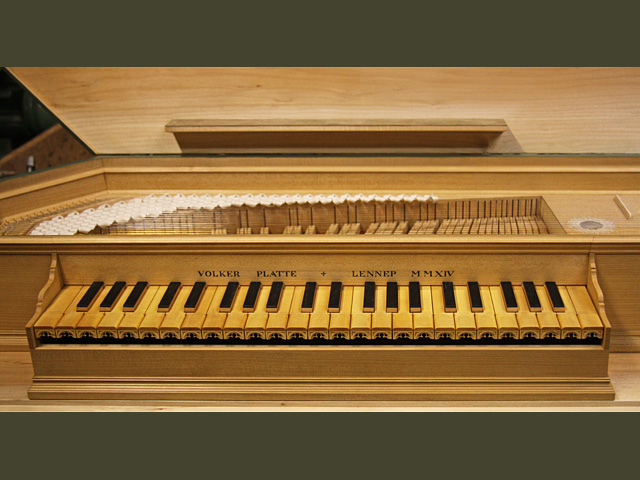 • Clavichord nach Dominicus Pisaurensis, 1543, Tonumfang: C/E – c“‘, 8′, 8′, drei- bis vierfach gebunden, doppelchörig, der dünnwandige Korpus aus Zypressenholz befindet sich in einem Kasten.