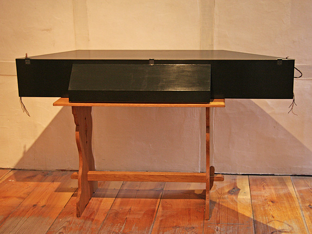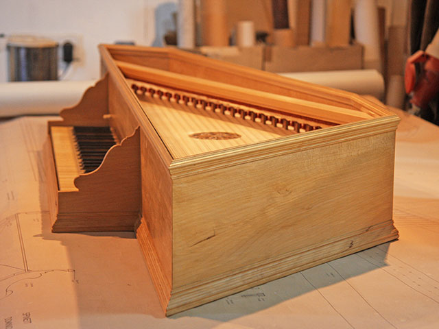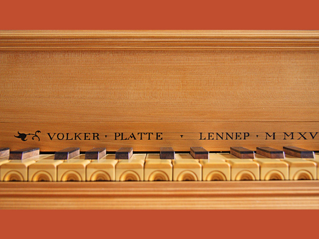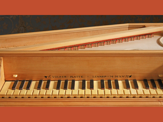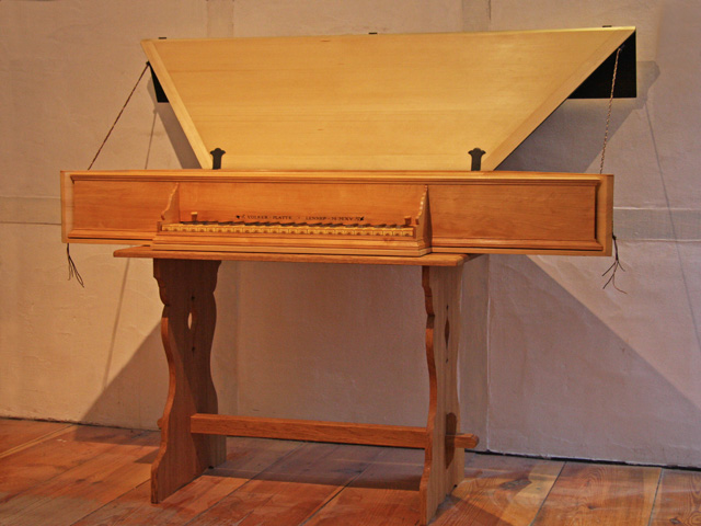 - Polygonales Spinett nach Dominicus Pisaurensis (1540) mit verkleinertem Tonumfang C/E – c“‘, 8′, mit Messingbezug, Stimmtonhöhe a’=440 Hz. Das dünnwandige Instrument besteht aus Zypressenholz mit aufwändigen Profilen und befindet sich in einem Kasten. Mit nur 8,4 kg (ohne Kasten) ist es sehr transportabel und durch seinen kräftigen Klang auch als Continuo-Instrument einsetzbar.